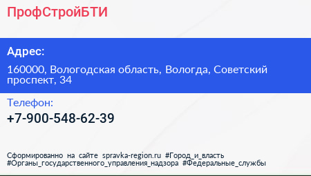 ПрофСтройБТИ по адресу 160000, Вологодская область, Вологда, Советский проспект, 34 в дальнейшем Организация, размещена в следующих категориях: