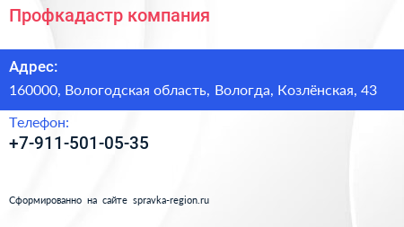 Профкадастр, компания по адресу 160000, Вологодская область, Вологда, Козлёнская, 43 в дальнейшем Организация, размещена в следующих категориях: