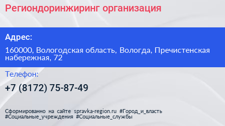 Региондоринжиринг, организация по адресу 160000, Вологодская область, Вологда, Пречистенская набережная, 72 в дальнейшем Организация, размещена в следующих категориях: