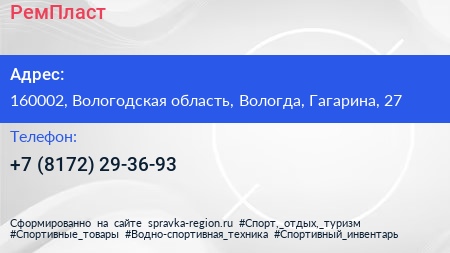 РемПласт по адресу 160002, Вологодская область, Вологда, Гагарина, 27 в дальнейшем Организация, размещена в следующих категориях: