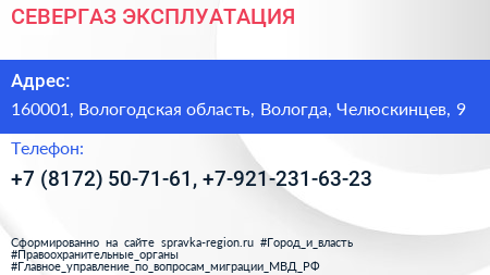 СЕВЕРГАЗ ЭКСПЛУАТАЦИЯ по адресу 160001, Вологодская область, Вологда, Челюскинцев, 9 в дальнейшем Организация, размещена в следующих категориях: