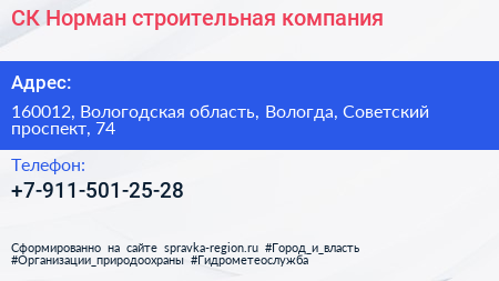 СК Норман, строительная компания по адресу 160012, Вологодская область, Вологда, Советский проспект, 74 в дальнейшем Организация, размещена в следующих категориях: