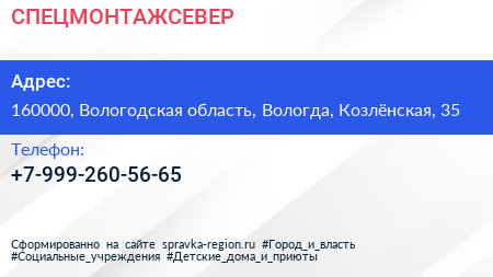 СПЕЦМОНТАЖСЕВЕР по адресу 160000, Вологодская область, Вологда, Козлёнская, 35 в дальнейшем Организация, размещена в следующих категориях: