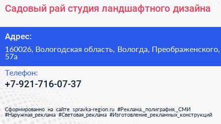 Садовый рай, студия ландшафтного дизайна по адресу 160026, Вологодская область, Вологда, Преображенского, 57а в дальнейшем Организация, размещена в следующих категориях:
