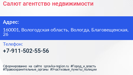 Салют, агентство недвижимости по адресу 160001, Вологодская область, Вологда, Благовещенская, 26 в дальнейшем Организация, размещена в следующих категориях: