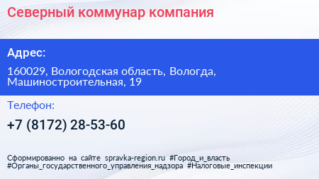 Северный коммунар, компания по адресу 160029, Вологодская область, Вологда, Машиностроительная, 19 в дальнейшем Организация, размещена в следующих категориях: