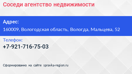 Соседи, агентство недвижимости по адресу 160009, Вологодская область, Вологда, Мальцева, 52 в дальнейшем Организация, размещена в следующих категориях:
