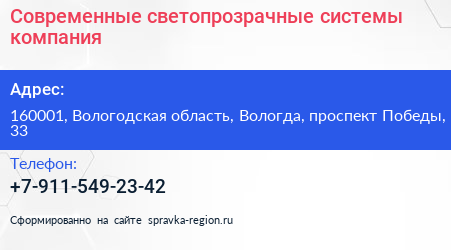 Современные светопрозрачные системы, компания по адресу 160001, Вологодская область, Вологда, проспект Победы, 33 в дальнейшем Организация, размещена в следующих категориях: