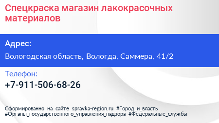 Спецкраска, магазин лакокрасочных материалов по адресу Вологодская область, Вологда, Саммера, 41/2 в дальнейшем Организация, размещена в следующих категориях:
