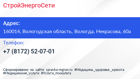СтройЭнергоСети по адресу 160014, Вологодская область, Вологда, Некрасова, 60а в дальнейшем Организация, размещена в следующих категориях: