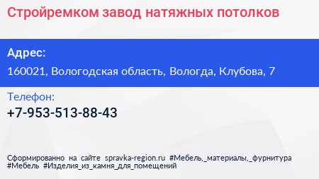 Стройремком, завод натяжных потолков по адресу 160021, Вологодская область, Вологда, Клубова, 7 в дальнейшем Организация, размещена в следующих категориях: