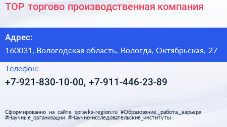 ТОР, торгово-производственная компания по адресу 160031, Вологодская область, Вологда, Октябрьская, 27 в дальнейшем Организация, размещена в следующих категориях: