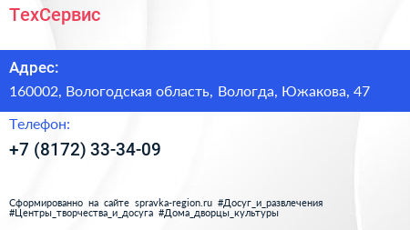 ТехСервис по адресу 160002, Вологодская область, Вологда, Южакова, 47 в дальнейшем Организация, размещена в следующих категориях: