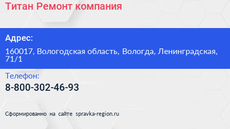 Титан Ремонт, компания по адресу 160017, Вологодская область, Вологда, Ленинградская, 71/1 в дальнейшем Организация, размещена в следующих категориях:
