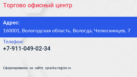 Торгово-офисный центр по адресу 160001, Вологодская область, Вологда, Челюскинцев, 7 в дальнейшем Организация, размещена в следующих категориях: