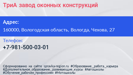 ТриА, завод оконных конструкций по адресу 160000, Вологодская область, Вологда, Чехова, 27 в дальнейшем Организация, размещена в следующих категориях: