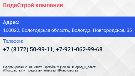 ВодаСтрой, компания по адресу 160022, Вологодская область, Вологда, Новгородская, 35 в дальнейшем Организация, размещена в следующих категориях: