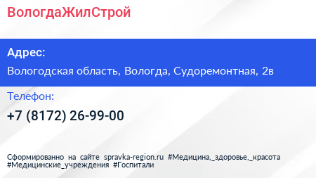 ВологдаЖилСтрой по адресу Вологодская область, Вологда, Судоремонтная, 2в в дальнейшем Организация, размещена в следующих категориях: