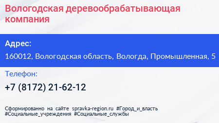 Вологодская деревообрабатывающая компания по адресу 160012, Вологодская область, Вологда, Промышленная, 5 в дальнейшем Организация, размещена в следующих категориях: