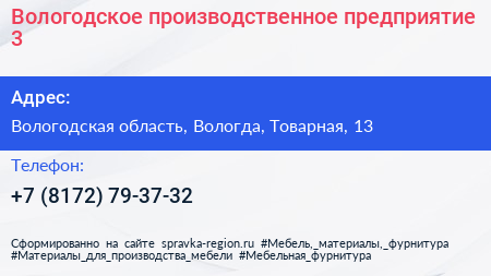 Вологодское производственное предприятие №3 по адресу Вологодская область, Вологда, Товарная, 13 в дальнейшем Организация, размещена в следующих категориях: