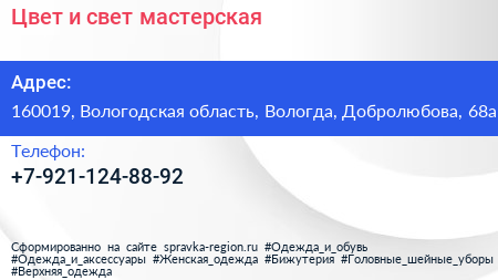 Цвет и свет, мастерская по адресу 160019, Вологодская область, Вологда, Добролюбова, 68а в дальнейшем Организация, размещена в следующих категориях: