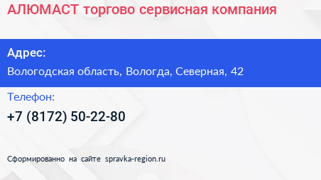 АЛЮМАСТ, торгово-сервисная компания по адресу Вологодская область, Вологда, Северная, 42 в дальнейшем Организация, размещена в следующих категориях: