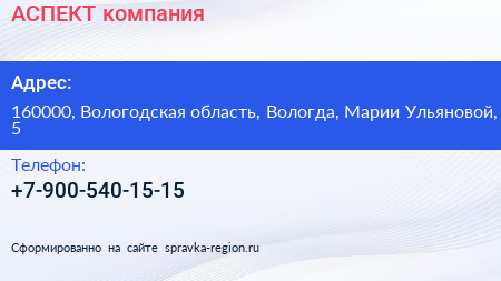 АСПЕКТ, компания по адресу 160000, Вологодская область, Вологда, Марии Ульяновой, 5 в дальнейшем Организация, размещена в следующих категориях: