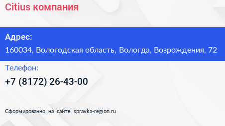 Citius, компания по адресу 160034, Вологодская область, Вологда, Возрождения, 72 в дальнейшем Организация, размещена в следующих категориях: