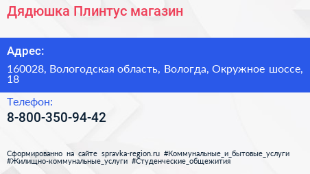 Дядюшка Плинтус, магазин по адресу 160028, Вологодская область, Вологда, Окружное шоссе, 18 в дальнейшем Организация, размещена в следующих категориях: