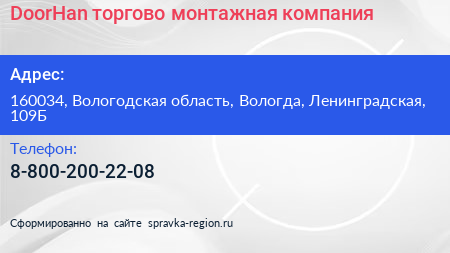 DoorHan, торгово-монтажная компания по адресу 160034, Вологодская область, Вологда, Ленинградская, 109Б в дальнейшем Организация, размещена в следующих категориях: