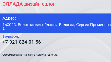 ЭЛЛАДА, дизайн-салон по адресу 160023, Вологодская область, Вологда, Сергея Преминина, 1 в дальнейшем Организация, размещена в следующих категориях: