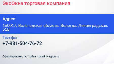 ЭкоОкна, торговая компания по адресу 160017, Вологодская область, Вологда, Ленинградская, 51Б в дальнейшем Организация, размещена в следующих категориях: