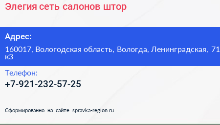 Элегия, сеть салонов штор по адресу 160017, Вологодская область, Вологда, Ленинградская, 71 к3 в дальнейшем Организация, размещена в следующих категориях: