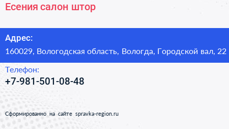 Есения, салон штор по адресу 160029, Вологодская область, Вологда, Городской вал, 22 в дальнейшем Организация, размещена в следующих категориях: