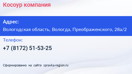 Косоур, компания по адресу Вологодская область, Вологда, Преображенского, 28а/2 в дальнейшем Организация, размещена в следующих категориях: