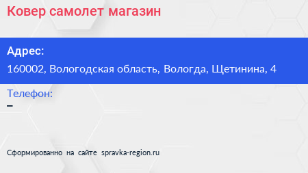 Ковер-самолет, магазин по адресу 160002, Вологодская область, Вологда, Щетинина, 4 в дальнейшем Организация, размещена в следующих категориях: