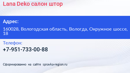 Lana Deko, салон штор по адресу 160028, Вологодская область, Вологда, Окружное шоссе, 18 в дальнейшем Организация, размещена в следующих категориях: