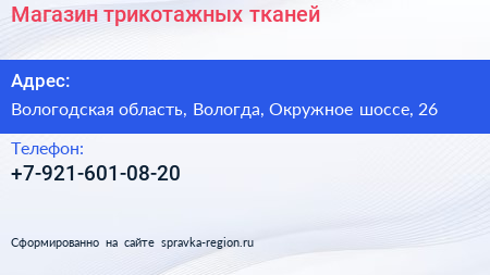 Магазин трикотажных тканей по адресу Вологодская область, Вологда, Окружное шоссе, 26 в дальнейшем Организация, размещена в следующих категориях: