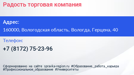 Радость, торговая компания по адресу 160000, Вологодская область, Вологда, Герцена, 40 в дальнейшем Организация, размещена в следующих категориях: