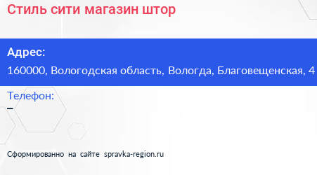 Стиль сити, магазин штор по адресу 160000, Вологодская область, Вологда, Благовещенская, 4 в дальнейшем Организация, размещена в следующих категориях: