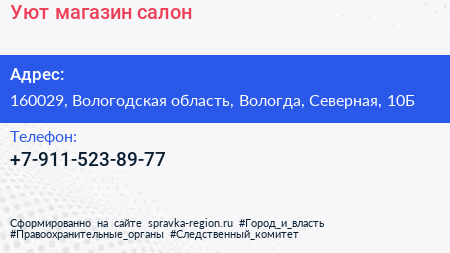 Уют, магазин-салон по адресу 160029, Вологодская область, Вологда, Северная, 10Б в дальнейшем Организация, размещена в следующих категориях: