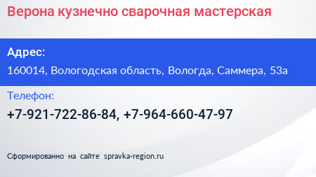 Верона, кузнечно-сварочная мастерская по адресу 160014, Вологодская область, Вологда, Саммера, 53а в дальнейшем Организация, размещена в следующих категориях: