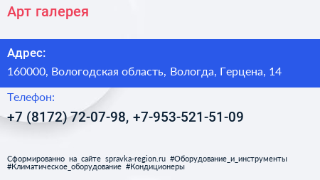 Арт-галерея по адресу 160000, Вологодская область, Вологда, Герцена, 14 в дальнейшем Организация, размещена в следующих категориях: