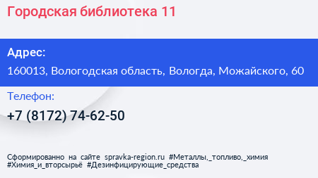 Городская библиотека №11 по адресу 160013, Вологодская область, Вологда, Можайского, 60 в дальнейшем Организация, размещена в следующих категориях: