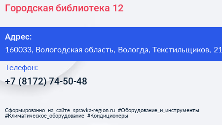 Городская библиотека №12 по адресу 160033, Вологодская область, Вологда, Текстильщиков, 21 в дальнейшем Организация, размещена в следующих категориях: