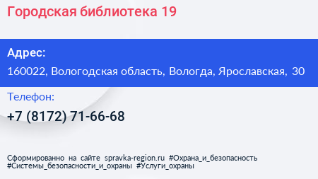 Городская библиотека №19 по адресу 160022, Вологодская область, Вологда, Ярославская, 30 в дальнейшем Организация, размещена в следующих категориях: