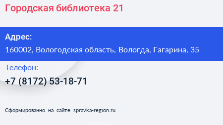 Городская библиотека №21 по адресу 160002, Вологодская область, Вологда, Гагарина, 35 в дальнейшем Организация, размещена в следующих категориях: