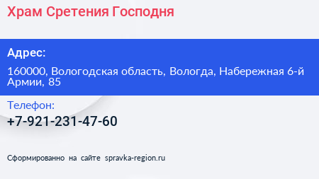 Храм Сретения Господня по адресу 160000, Вологодская область, Вологда, Набережная 6-й Армии, 85 в дальнейшем Организация, размещена в следующих категориях: