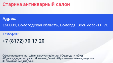 Старина, антикварный салон по адресу 160009, Вологодская область, Вологда, Зосимовская, 70 в дальнейшем Организация, размещена в следующих категориях: