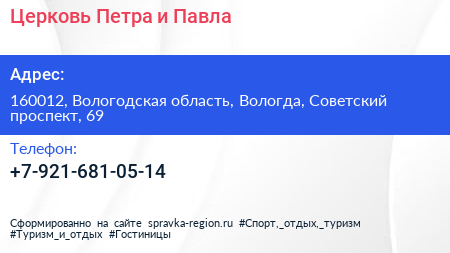 Церковь Петра и Павла по адресу 160012, Вологодская область, Вологда, Советский проспект, 69 в дальнейшем Организация, размещена в следующих категориях:
